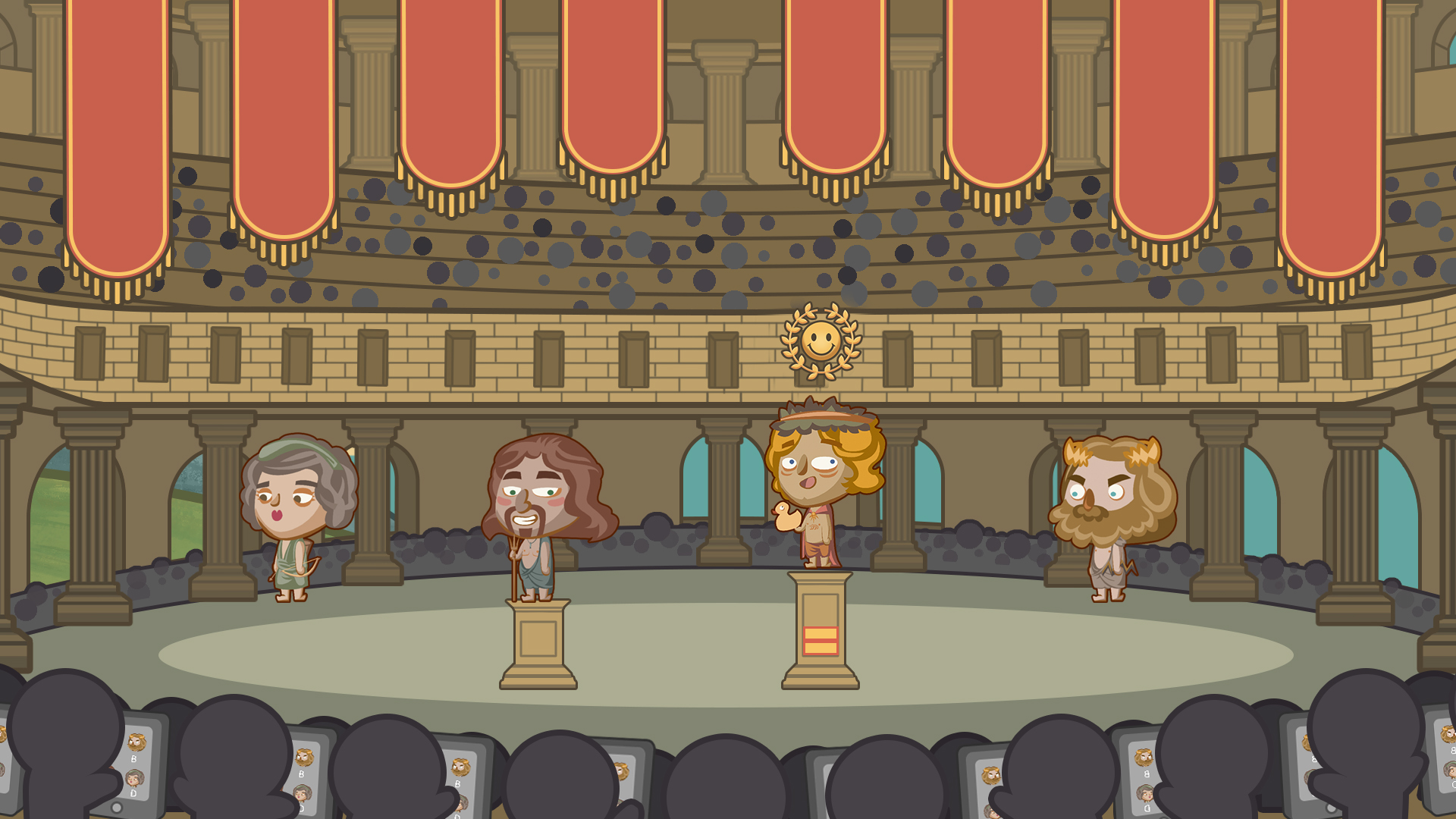 Mytholympics is a 2D couch co-op party game where players play as the forgotten Greek gods and goddesses competing for fame in a series of minigames. Before entering a minigame, players go through a round of team selection where they choose who to play with/against. Fame points are awarded to the team that wins a minigame, divided equally amongst the players on the winning team. The objective of the game is to get to the max amount of fame (points) first. Each minigame in Mytholympics has different mechanics and can support any team configuration.